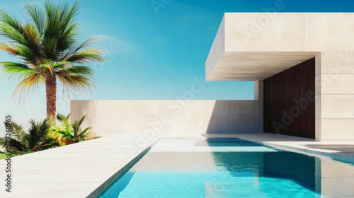 new concrete house in modern style with pool and parking for sale or rent and beautiful landscaping on background