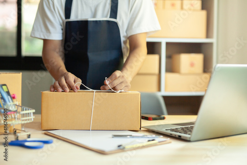new generation entrepreneur Use smartphones and notebook computers to take customer orders and take notes. Order and prepare shipping packages online to order and prepare packaged products.