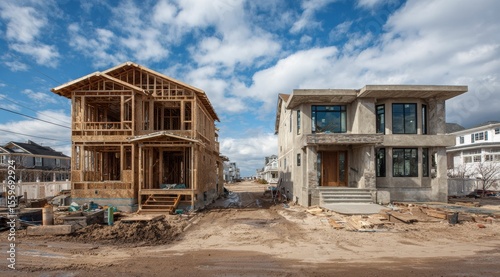 New homes are being constructed in a suburban area with wooden framing and construction tools, set under a sunny sky with exposed structural beams.