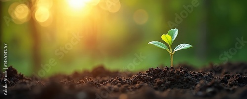 New life grows from soil at sunset. Small green plant symbolizes hope rebirth. Growing process, eco-friendly sustainable development concept. Green leaf against blurred background.