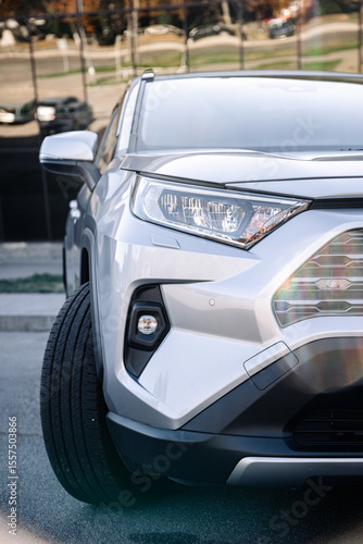New, stylish car parked in a city parking lot. Concept of leasing and buying a new car.