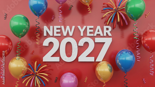 New Year 2027 celebration with colorful balloons and fireworks