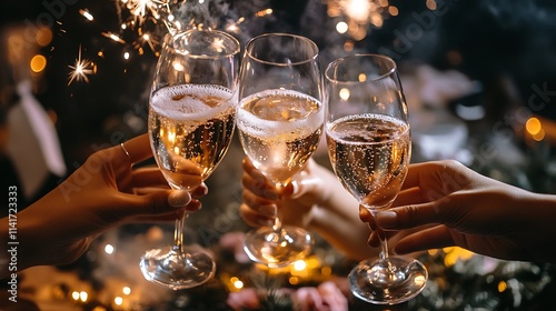 New Year Toast With Champagne Glasses And Golden Fireworks