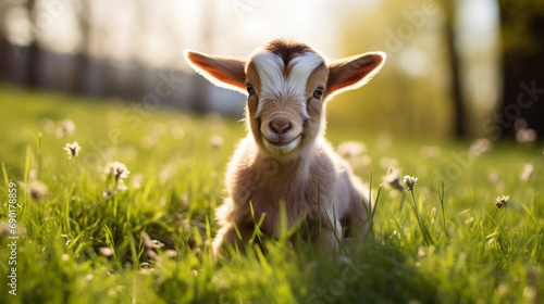 Newborn goatling resting on a green lawn in morning. Funny newborn young goat lying on the summer meadow.