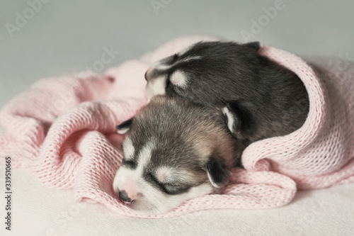 Newborn Siberian Husky puppy age of 1 days. Husky Dog Breeding. Concept of veterinary medicine, zoo clinic, veterinary clinic. Dog puppies sleep. Zoo hotel. Animal hotel. Goods for pets