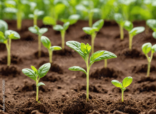 Newly Sprouted Plants Growing in Rich Soil on a Bright Sunny Day