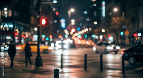 Night City Street Scene with Blurred Lights and Pedestrians in Urban Environment