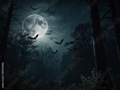 Night forest on a full moon, bats against the moon, mysticism, halloween.