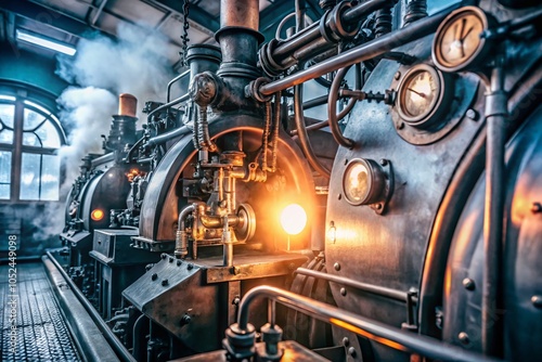 Night Photography of a Steam Locomotive Engine Room with Glowing Machinery and Warm Ambient Light
