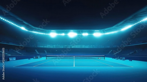 tennis, court, stadium, night, blue, light, arena, sport, game, competition, match, tournament, championship, athlete, player, racket, ball, indoor, illuminated, bright, empty, seat, spectator, line, net, service, baseline, center, dark, shadow, atmosphere, dramatic, intense, energy, powerful, professional, grand, event, facility, structure
