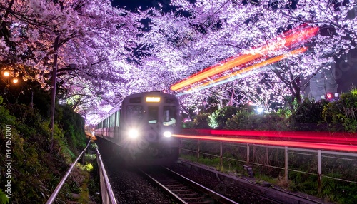 train, night, cherry, blossom, pink, light, light, trail, motion, blur, dark, transportation, travel, city, railway, blossom, sakura, spring, japan, evening, purple, flower, tree, urban, speed, movement, rail, public, transport, illuminated, scene, electric, station, suburban, commuter, scenic, beautiful, nature, photo, image, photo, picture, railroad, track, background, blurred, glowing, vibrant