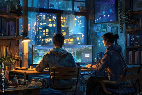 night, city, window, desk, computer, work, office, room, home, figure, people, 2, dimly, lit, bright, light, building, view, large, sitting, working, night time, screen, keyboard, mouse, chair, lamp, bookshelf, book, dark, blue, yellow, interior, design, illustration, art