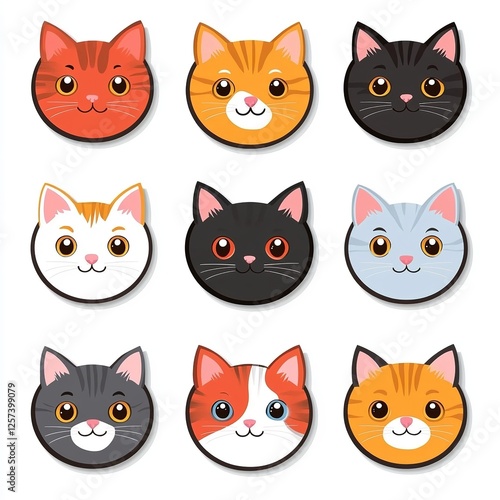 Nine Adorable Cartoon Cat Faces Cute Pet Icons Happy Animals Digital Illustrations Vector Graphics Design Elements Perfect for Kids Projects Websites