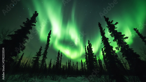 Northern aurora light. Green borealis in night sky. Arctic polar gradient on north pole. Abstract finland bg with boreal landscape backdrop. Black tree design in fjord to travel illustration