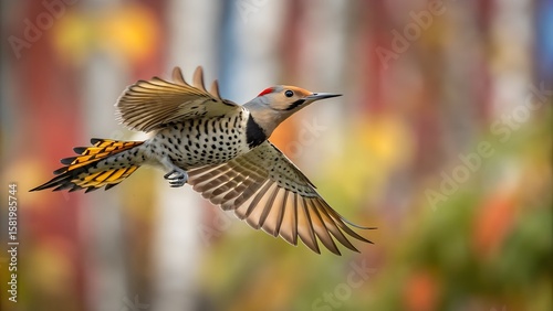 Northern Flicker Flying with Spread Wings and Colorful Blurred Background