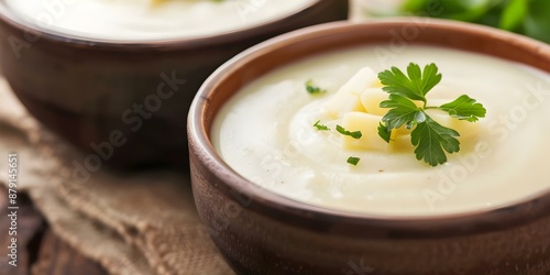 Nostalgic Comfort Creamy and Hearty Irish Potato Soup in Bowls. Concept Potato Soup Recipe, Irish Inspired, Comfort Food, Winter Warmer, Hearty Soup