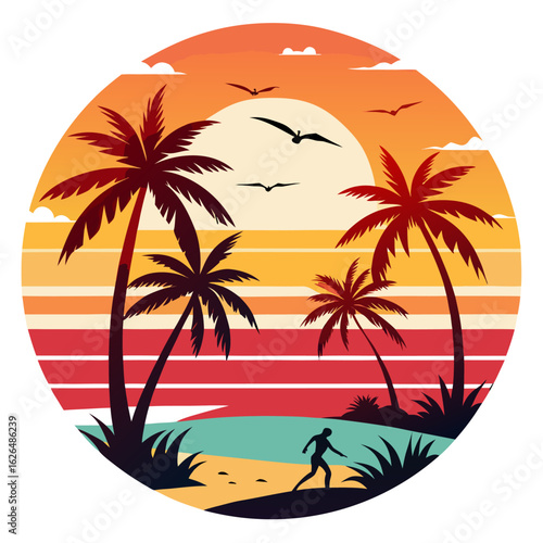 Nostalgic Surf Sunset – Tropical Vector with Central Surfer and Palm Trees