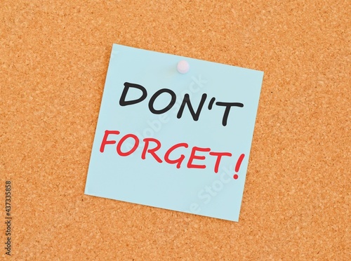 Note with don't forget. Blank light blue sticky note with don't forget pined on a cork bulletin board.