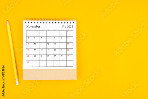 November 2025 desk calendar and wooden pencil on yellow color background.