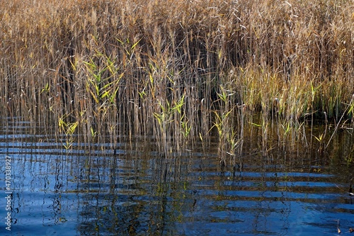 November on the lake. Coastal reeds and reflection in the water. Waves.