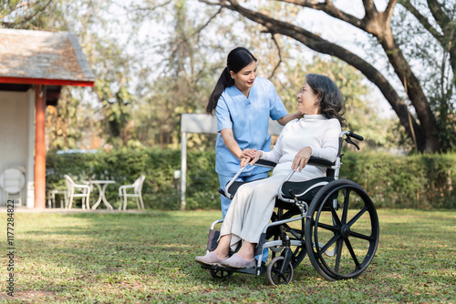 Nurse and Elderly Patient in Wheelchair Enjoying a Peaceful Garden Setting on a Sunny Day