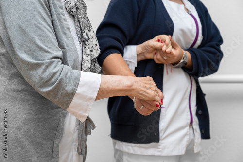 Nurse helping elderly woman walk in the room, holding his hand, supporting her. Treatment and rehabilitation after injury or stroke, life in assisted living facility, senior care concept.