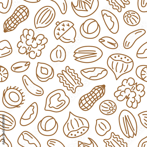 Nut seamless pattern. Flat line icon background with hazelnut, pecan, almond, chestnut, pistachio, walnut, peanut. Vector illustration.