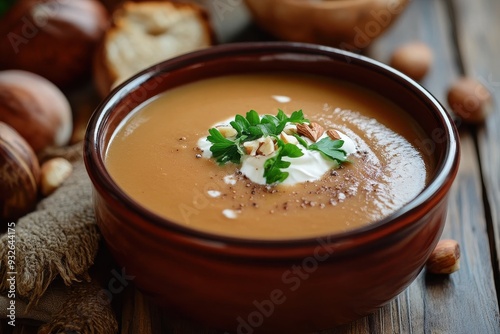 Nutritious chestnut soup with sour cream in a bowl