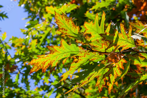 oak, tree, foliage, turning, yellow, autumn, leaf, fall, oak tree, colourful, park, nature, plant, season, green, element, design, acorn, light, growth, organic, symbol, life, fallen, fresh, nobody