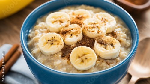 Oatmeal with Banana and Cinnamon: A close-up of a bowl of oatmeal topped with banana slices and a sprinkle of cinnamon. The bowl is on a wooden table with a banana and cinnamon sticks