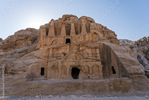 Obelisk Tomb and Bab as-Siq Triclinium burial caves in the Necropolis hills on walk from entrance to As Siq in Petra