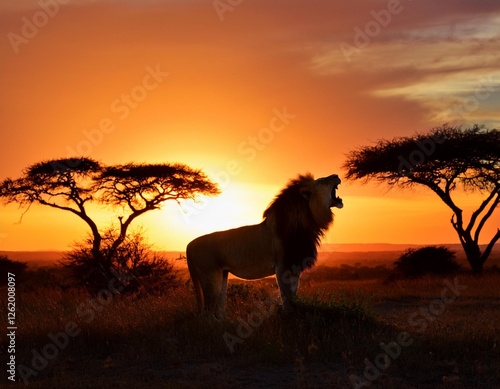 Observing a Majestic Lion Roaring at Sunset with Silhouettes of Acacia Trees Framing the Scene Against a Fiery Orange Sky