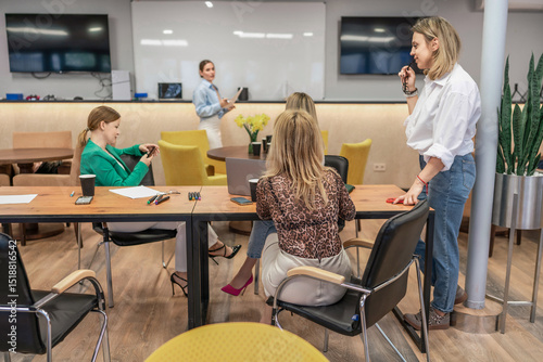 meeting, co-worker, office, woman, table, laptop, teamwork, collaboration, presentation, business, discussion, attire, leader, planning, strategy, brainstorming, design, interior, modern, workplace, desk, chair, project, innovation, analysis, solution, vision, communication, jean, heel, leopard, blazer, smart, casual attire