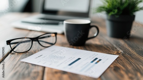 Office desk resume review, coffee, glasses