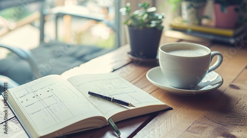 Office desk with a notebook, a pen and a cup of coffee generative ai