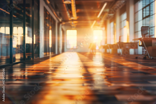 Office interior glowing with warm sunset light creating a comfortable and inviting work environment with reflections on floor
