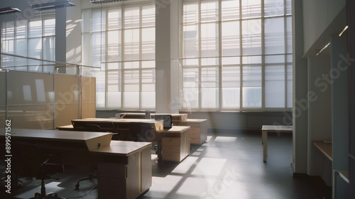Office with large windows and several desks in a bright, airy environment, designed to enhance productivity and comfort.