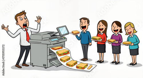 office, men at work, shocked, photocopier, machine, malfunction, sandwich, food, lunch, break, colleague, team, waiting, ravenous, surprised, funny, cartoon, illustration, humor, workplace, comedy, unexpected, problem, solution, error, strange, scene, business, employee, staff, gathering, sharing, eating, enjoying, amused, astonished, absurd, situation, graphic, design, artwork, isolated, background, white background, digital artwork, vector