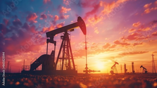 Oil derricks pumping at sunset. Concept of fossil fuels, energy, industry, extraction, and environment