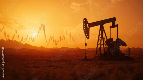 Oil drilling rig silhouetted against vibrant sunset in desert landscape, with price chart overlay symbolizing market trends and energy production