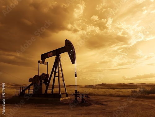 Oil pump jack operating in a barren field with a dramatic sunset and moody clouds creating a picturesque atmospheric landscape in the rural countryside