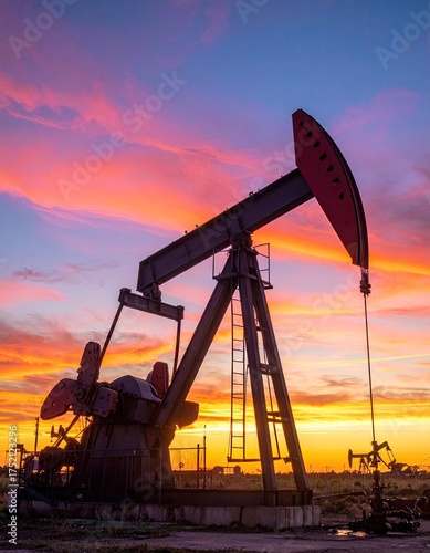 Oil pump jack silhouette against vibrant sunset sky energy production.