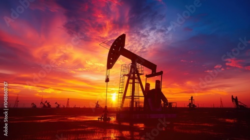 Oil Pump Jack Silhouette at Sunset with Vibrant Sky