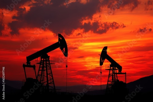 Oil pumpjacks silhouette against a dramatic red sunset sky with clouds in an industrial landscape