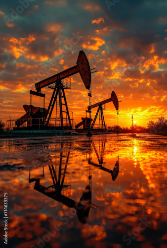 Oil pumps against a sunset stock photo. An oil pump extracting natural resources in the middle of a body of water.