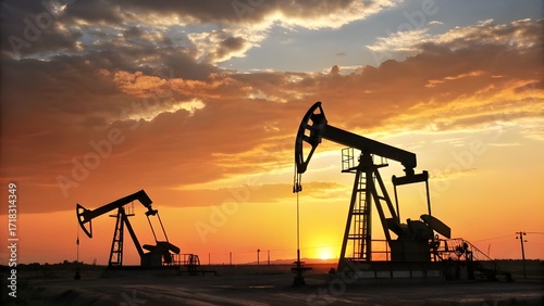 Oil pumps silhouetted against a vibrant sunset, symbolizing energy production and the industry's connection to nature's beauty and power