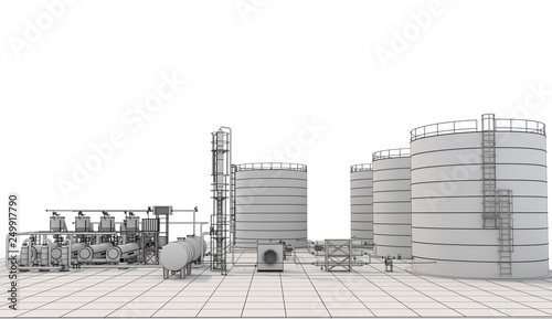 oil refinery, chemical production, waste processing plant, exterior visualization, 3D illustration