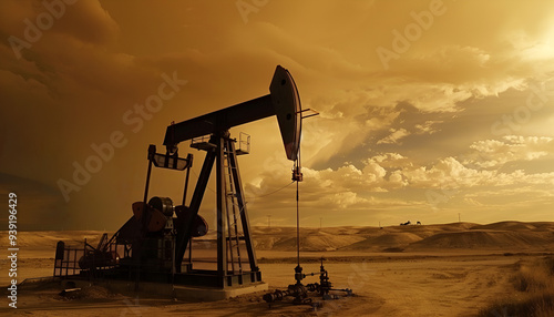 Oil rig in the desert on a background of a dramatic sky. Symbol of the crisis in the oil industry