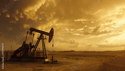 Oil rig in the desert on a background of a dramatic sky. Symbol of the crisis in the oil industry