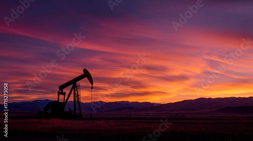 oil well, sunset, silhouette, landscape, sky, cloud, mountain, hill, horizon, energy, industry, nature, evening, sunrise, colours, red, orange, purple, pink, twilight, dramatic, vibrant, color image, visual, golden hour, photo, copy space, dark, light, background, fisheye